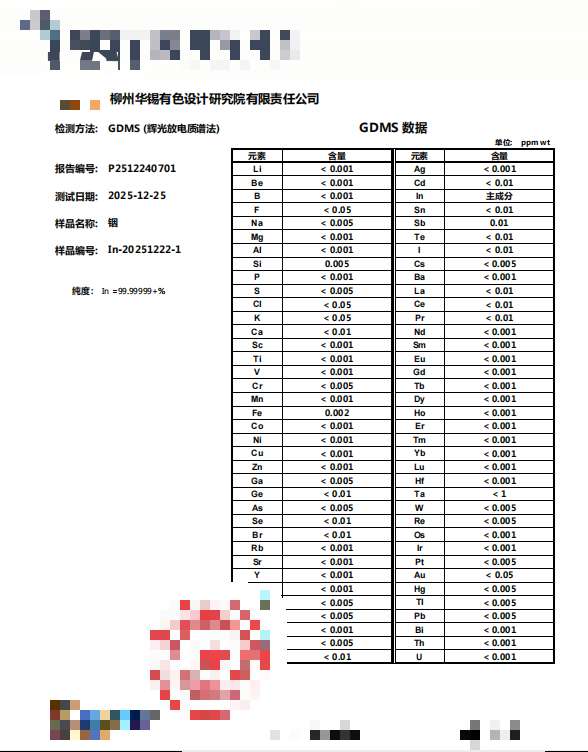 2025年12月25日,北部灣港集團旗下華錫有色設(shè)計研究院取得重大技術(shù)突破——成功研發(fā)并制備出純度高達99.99999%(7N級)的高純銦產(chǎn)品。經(jīng)權(quán)威第三方檢測,各項指標(biāo)均達行業(yè)領(lǐng)先標(biāo)準(zhǔn)。這一成果標(biāo)志著華錫有色設(shè)計院在高純金屬材料制備領(lǐng)域?qū)崿F(xiàn)跨越式發(fā)展。